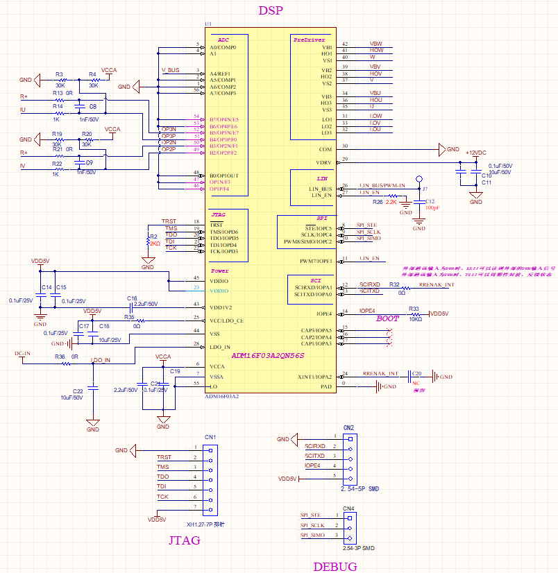 相電流采樣電阻200mR 放置在低邊三相任意兩相上,通過差分走線連接至ADM16F03A2的PGA的外圍放大電路。